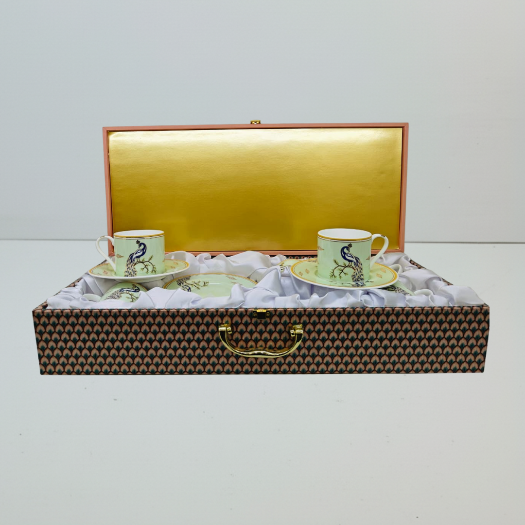 The Regal Peacock design captures the beauty of India’s national bird in all its elegance. Hand-detailed peacock motifs on a pastel base, highlighted with golden rims, make this set a stunning addition to your collection. Packaged in a premium gift box, it’s perfect for weddings, festive gifting, or elevating your own tea service.