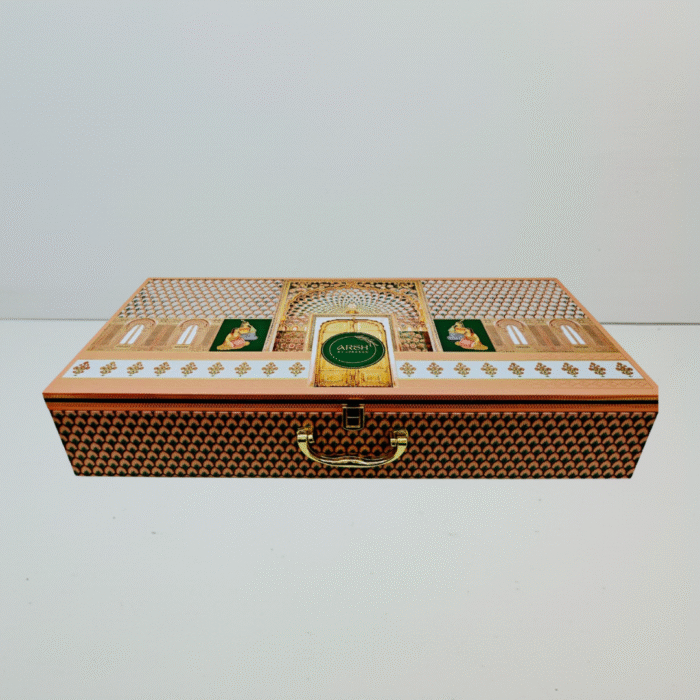 Encased in a luxurious box that is inspired by Rajasthani artwork with gold foiling, latch lock, and a handle