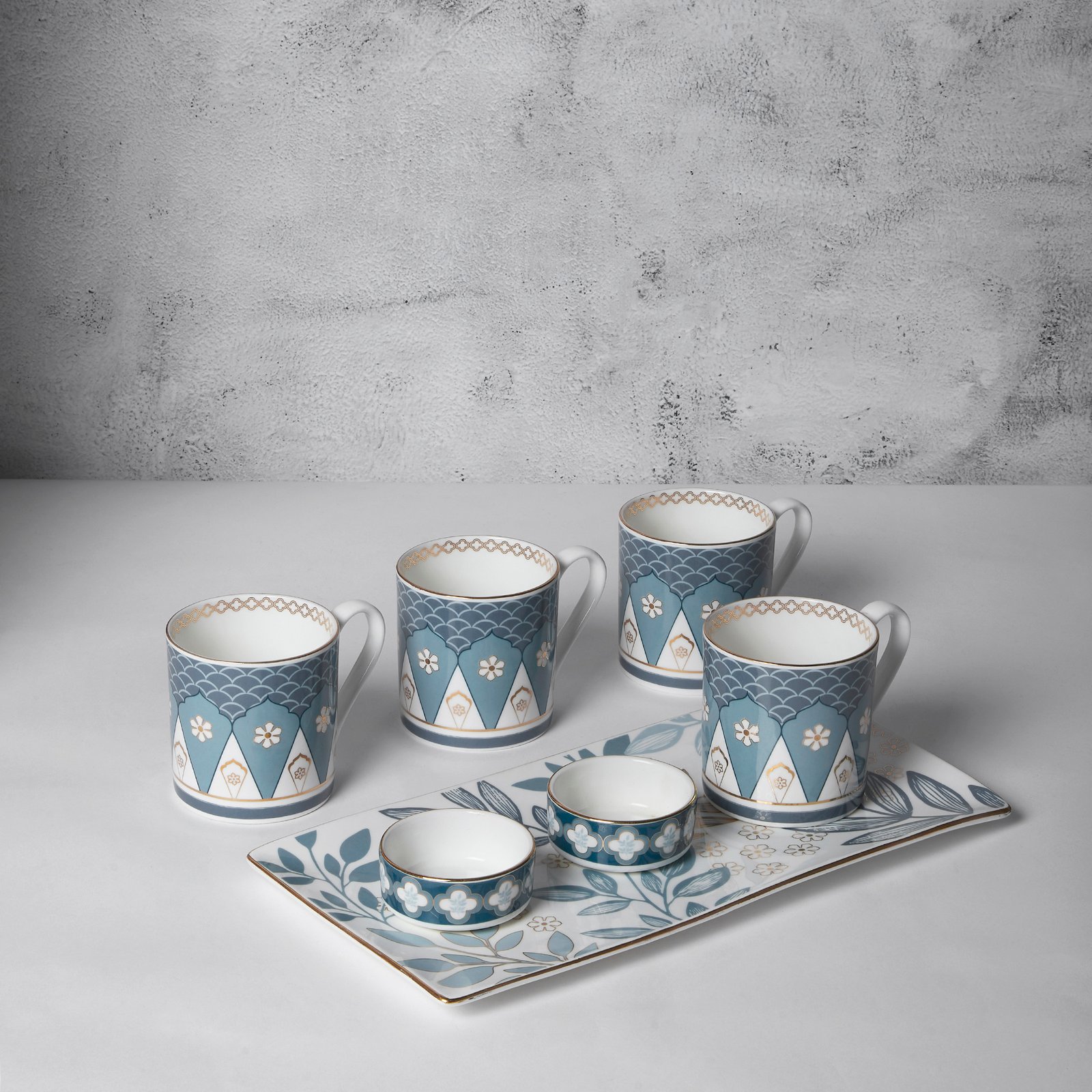 India Circus Snack Set – with Tea, Coffee Mugs and Snack Platter with Dip Bowl Set for Snacks, Hot Drinks, Gifting. Set of 7 pcs, Oceanic Opulence