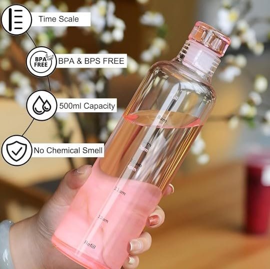 Premium Borosilicate Glass Water Bottle with Time Marker, 500ml, Pink